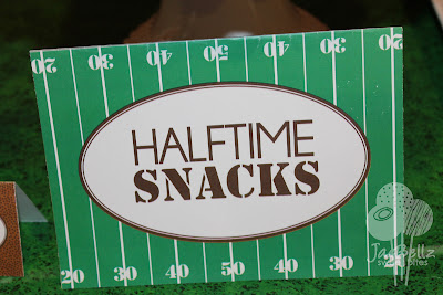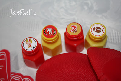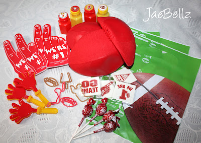 Goody Bags: Each child got a football (inflated, not shown in picture), bubbles, foam finger hand clapper, football silly bands, tattoo, and a lollipop.